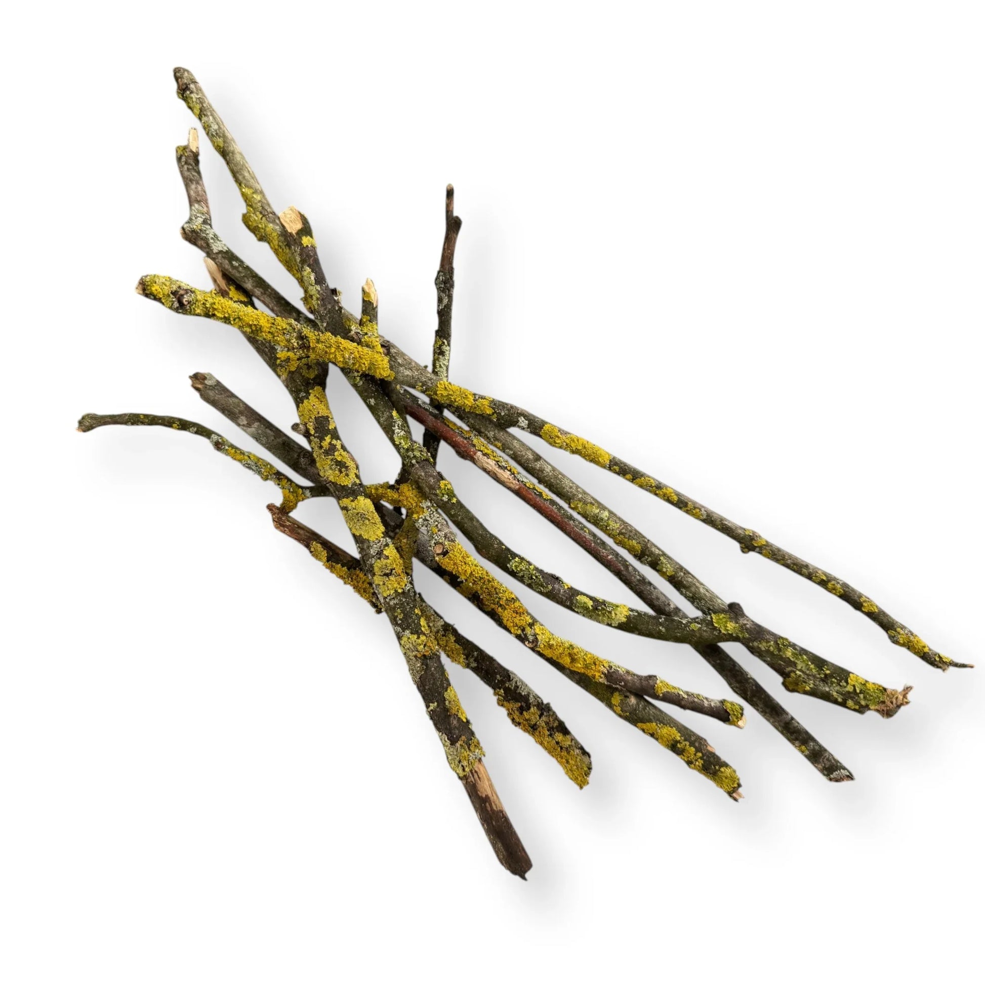 Die Flechten dienen als zusätzliche Strukturierung und schaffen ein mikroklimatisches Gleichgewicht – ideal für feuchtigkeitsliebende Arten. Jeder Ast ist ein Unikat aus nachhaltiger Sammlung, unbehandelt und frei von schädlichen Substanzen.